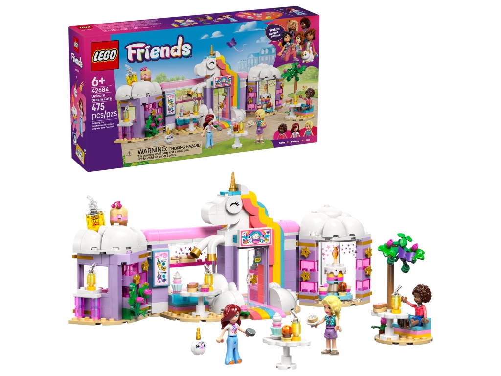 - Набор с радужным кафе — с помощью этого детального набора LEGO Friends «Кафе с единорогом» 42684, включающего три мини-лепелки и игрушечные пирожные, которые стимулируют воображение, дети в возрасте от шести лет могут играть в владельцев кафе